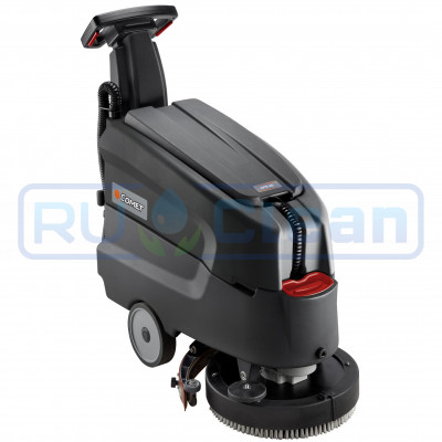 Машина управляется пешим оператором и не оснащена приводом движения. Движение осуществляется за счет усилия толкания, а также за счет вращения щетки. Усилие толкания на ровной горизонтальной поверхности не превышает 2-3 кг. Электропитание осуществляется от аккумуляторных батарей, установленных на борту моечного агрегата. Машина полностью автономна: во время работы оператору не нужно отвлекаться и регулярно поправлять сетевой кабель. Бортовая сеть 24 В - два аккумулятора по 12 В соединены последовательно. Машина комплектуется тяговыми аккумуляторными батареями гелевого типа. Емкость батарей 25 Ач (при С5), время работы от одного заряда порядка 1.2 часа.