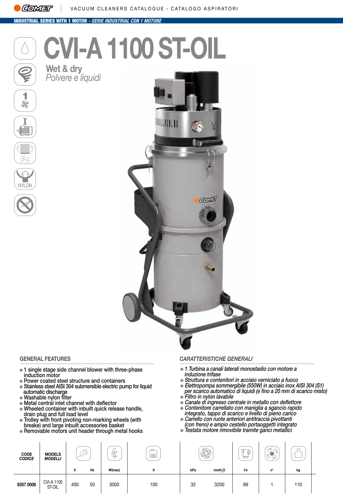 Пылеводосос Comet CVI-A 1100 ST-OIL - профессиональная модель для влажной и сухой уборки.