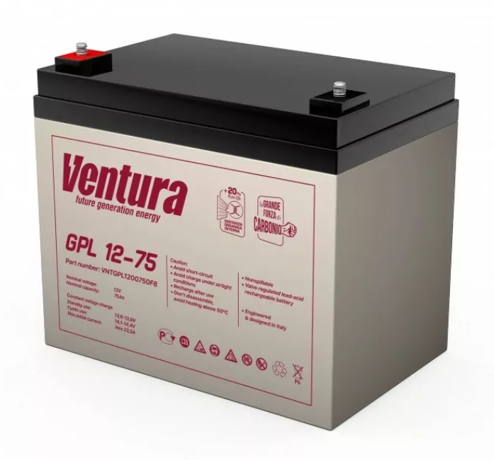 Аккумулятор Ventura GPL 12-75 - универсальная батарея с увеличенным сроком службы до 12 лет. Это достигается не только применением толстых намазных пластин, но и использованием специальных легирующих добавок, повышающих коррозионную стойкость пластин и исключающих их деформирование. Кроме того, стекловолоконный сепаратор АКБ изготовлен из боросиликатного стекла, что обеспечивает повышенную пористость сепаратора, а также его высокую устойчивость к воздействию высоких температур и серной кислоты. Аккумулятор предназначен для эксплуатации как в режиме постоянного подзаряда, так и в циклическом режиме.